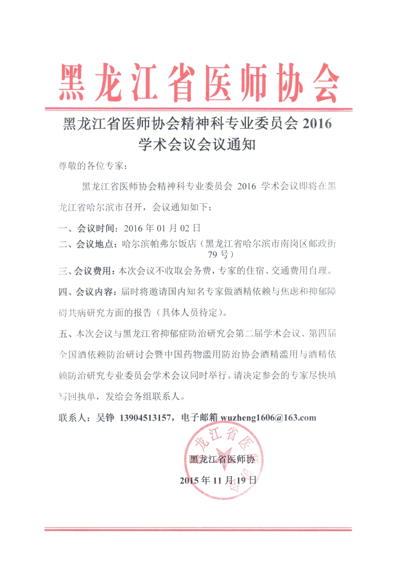 黑龙江省医师协会精神科专业委员会2016学术会议通知