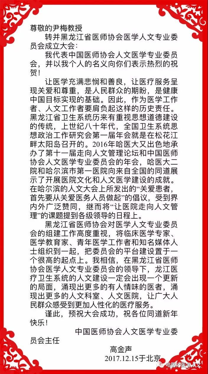 中国医师协会人文医学委员会主任委员高金声教授发来贺信: