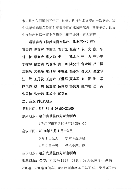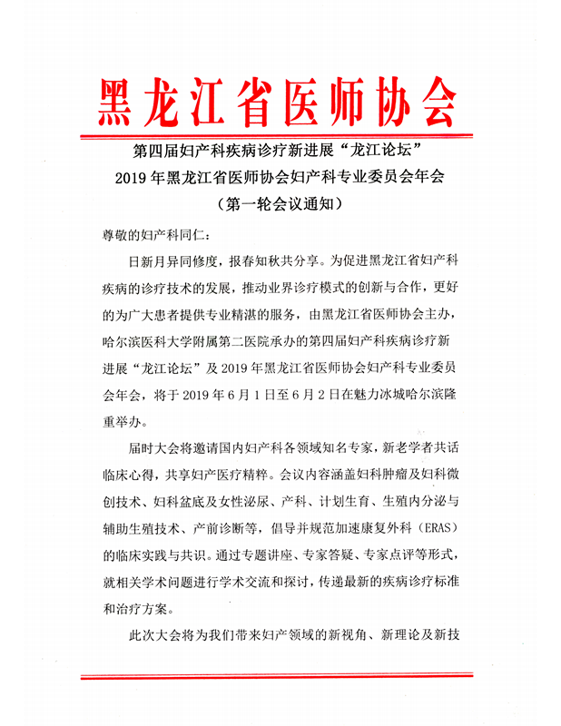 第四节妇产科疾病诊疗新进展“龙江论坛”2019年黑龙江省医师协会妇产科专业委员会年会(第一轮会议通知)