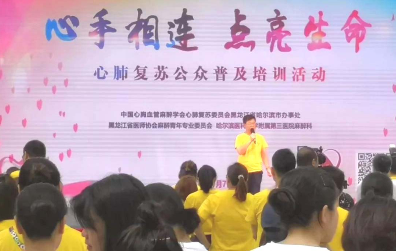 2019 年 7 月 7 日,黑龙江省医师协会麻醉青年专业委员会,以“心手相连,点亮生命”主题,开展了“传播急救技能 挽救宝贵生命-心手相连,点亮生命心肺复苏培训”公益活动。本次活动增加了院前心肺复苏急救技术的普及率,提高了群众自救互救能力。