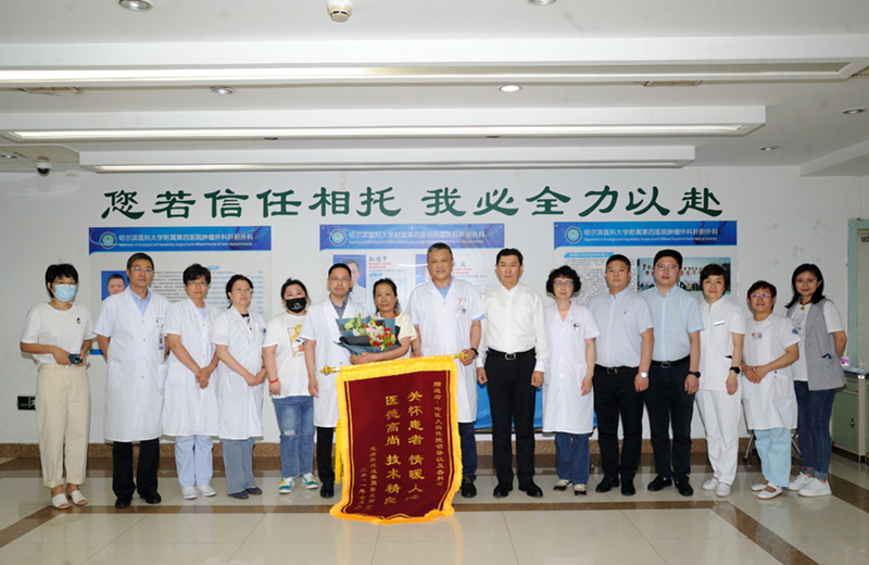 5日下午,徐万海院长、吴江副院长带领参与手术及治疗的专家成员来到病房内探望病人赵女士,并祝贺她顺利康复出院。赵女士紧握住徐院长的手激动不已,感慨万分:“是哈医大哈医大四院本着“明德至善,博学致精”的理念,为黑龙江百姓解除疾苦,。这台超级手术的顺利完成,具有划时代意义,不仅印证了哈医大四院具有多学科团队协作的顶尖技术储备,还标志着黑龙江省肝胆外科领域的技术实力已经迈入国内先进行列!四院给了我第二次生命”!病人家属送上鲜花和锦旗,与医疗团队合影留念。