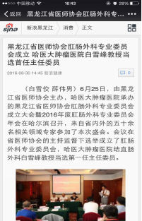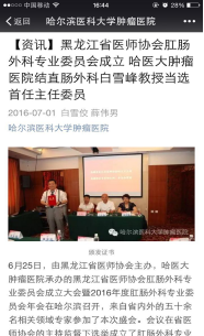 6月25日,由黑龙江省医师协会主办,哈医大附属肿瘤医院承办的《黑龙江省医师协会肛肠外科专业委员会成立大会暨2016年度肛肠外科专业委员会年会》在哈尔滨最佳西方财富酒店盛大召开,来自省内外的五十多名相关领域专家参加了本次盛会,会议在省医师协会的主持监督下选举成立了肛肠外科专业委员会,来自哈医大附属肿瘤医院的白雪峰教授当选为委员会第一任主任委员。